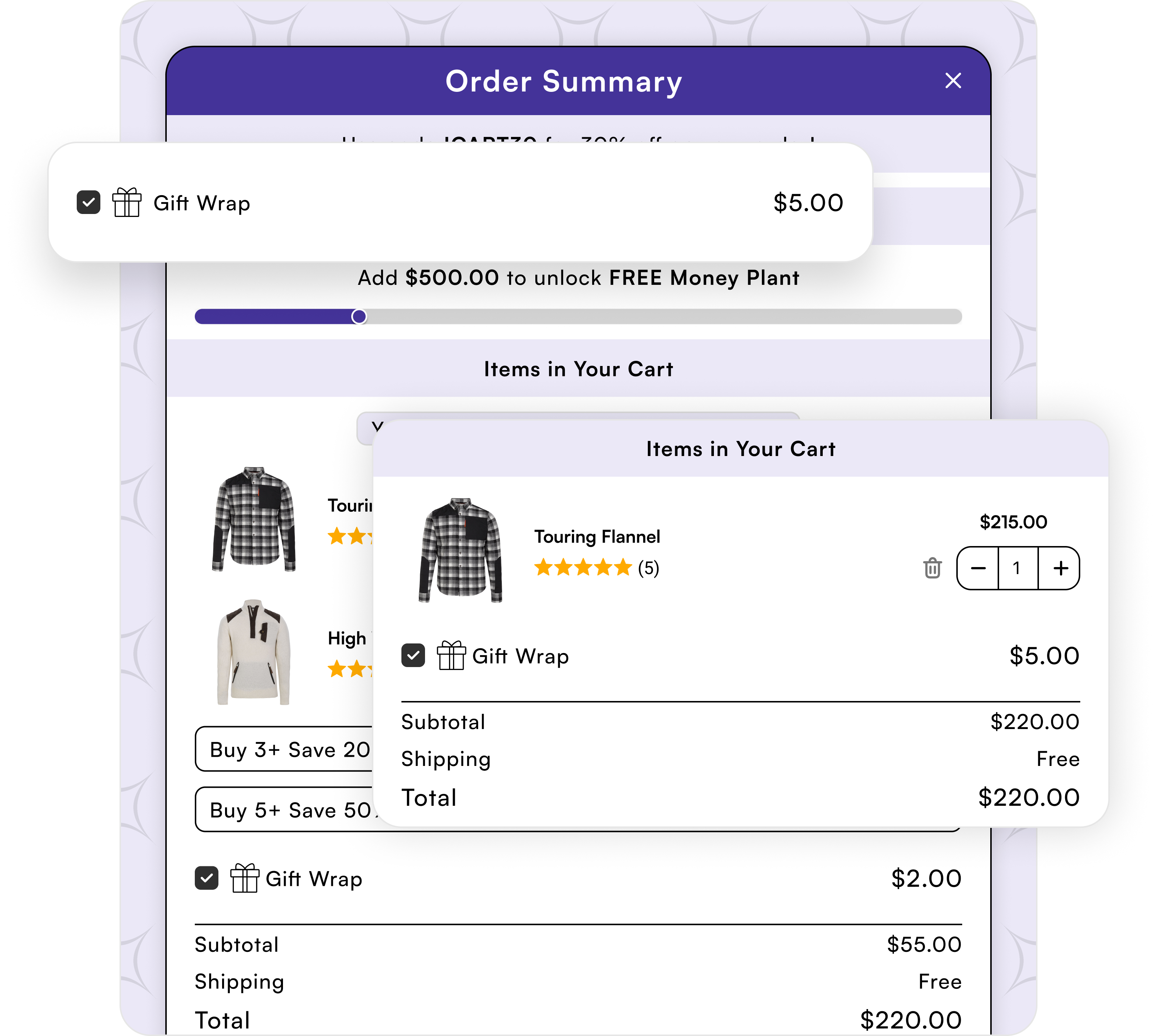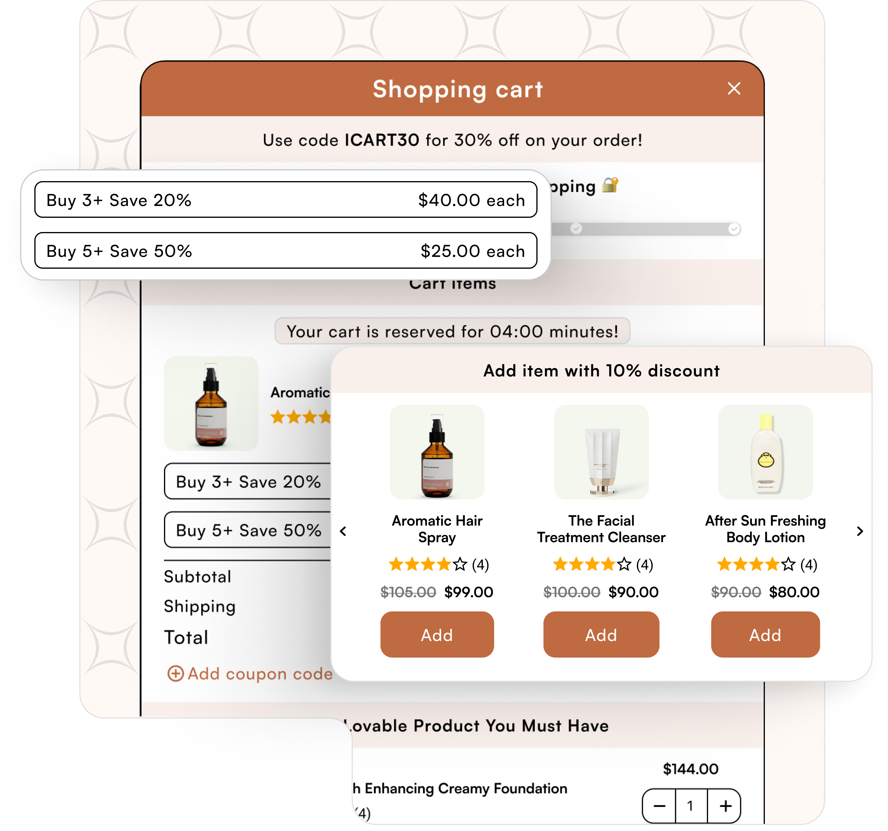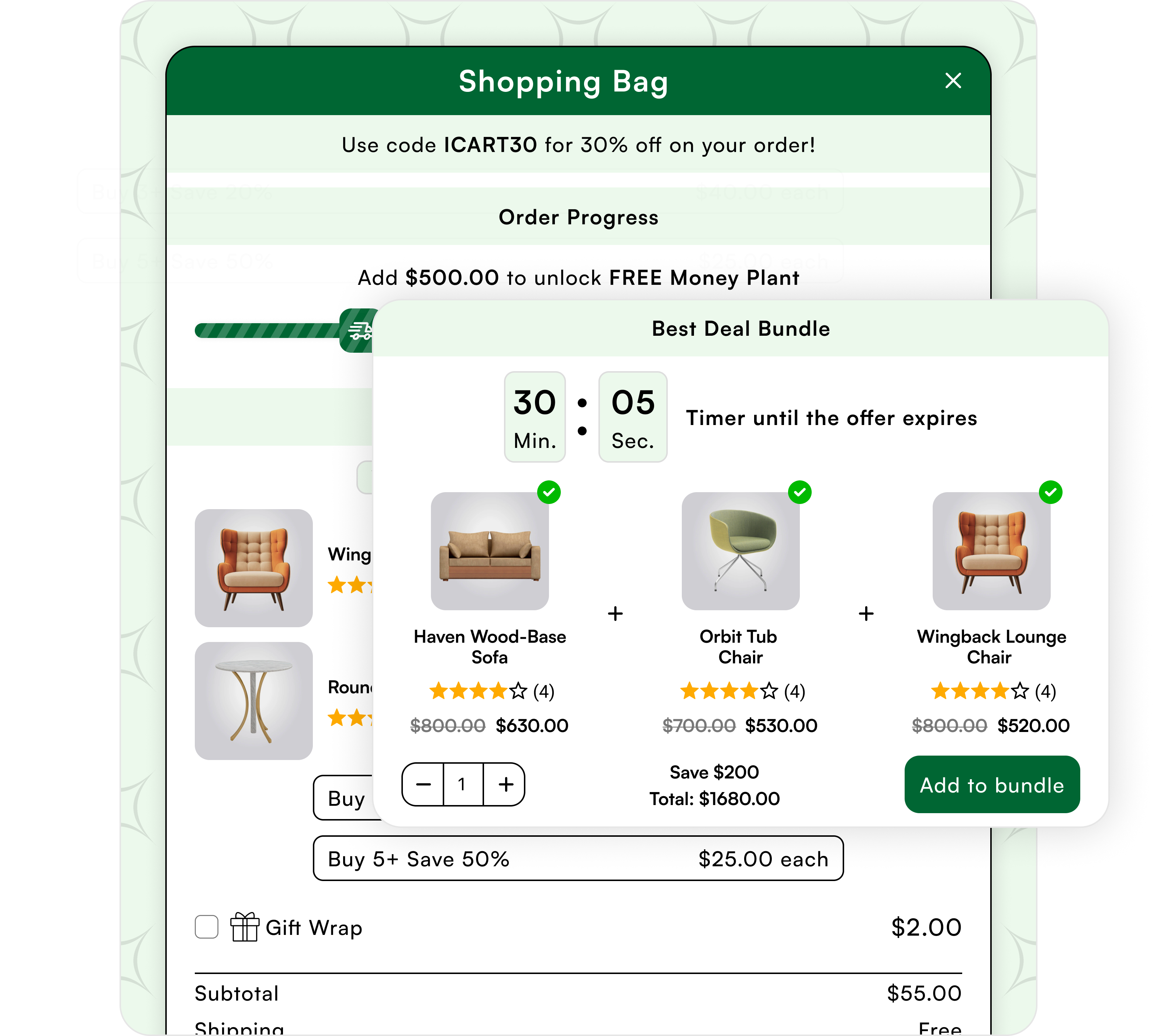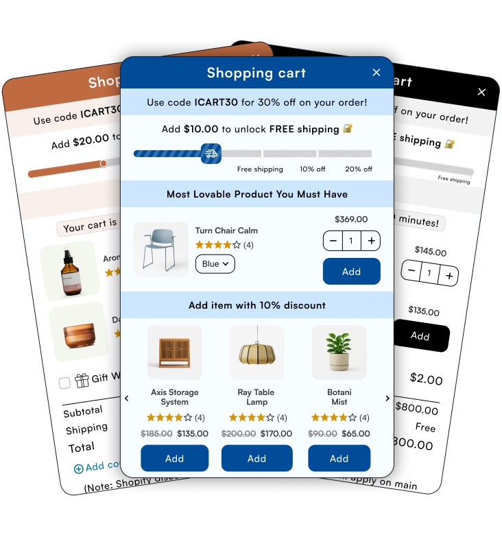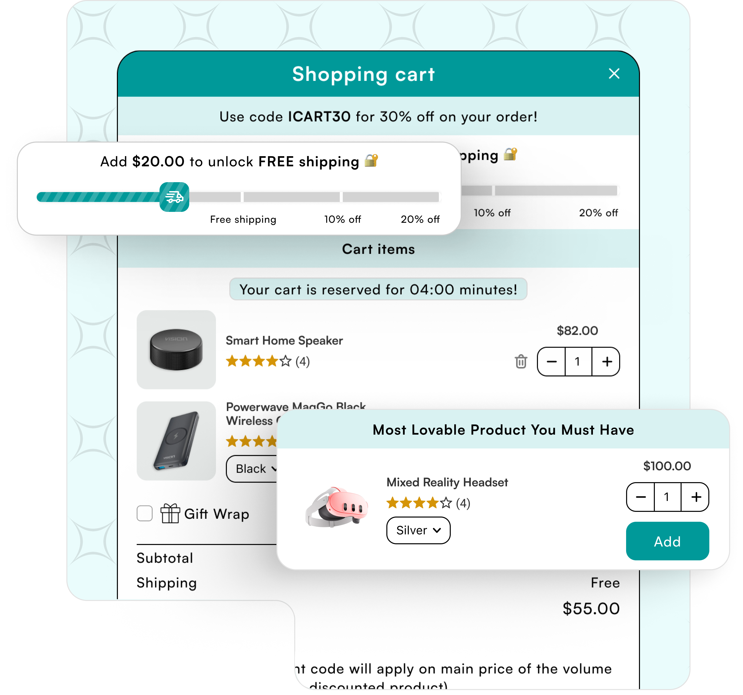 Turn abandoned carts into completed purchases with iCart. Create a fully customized cart experience in minutes & boost AOV by offering smart upsell & cross-sell offers right in the cart.