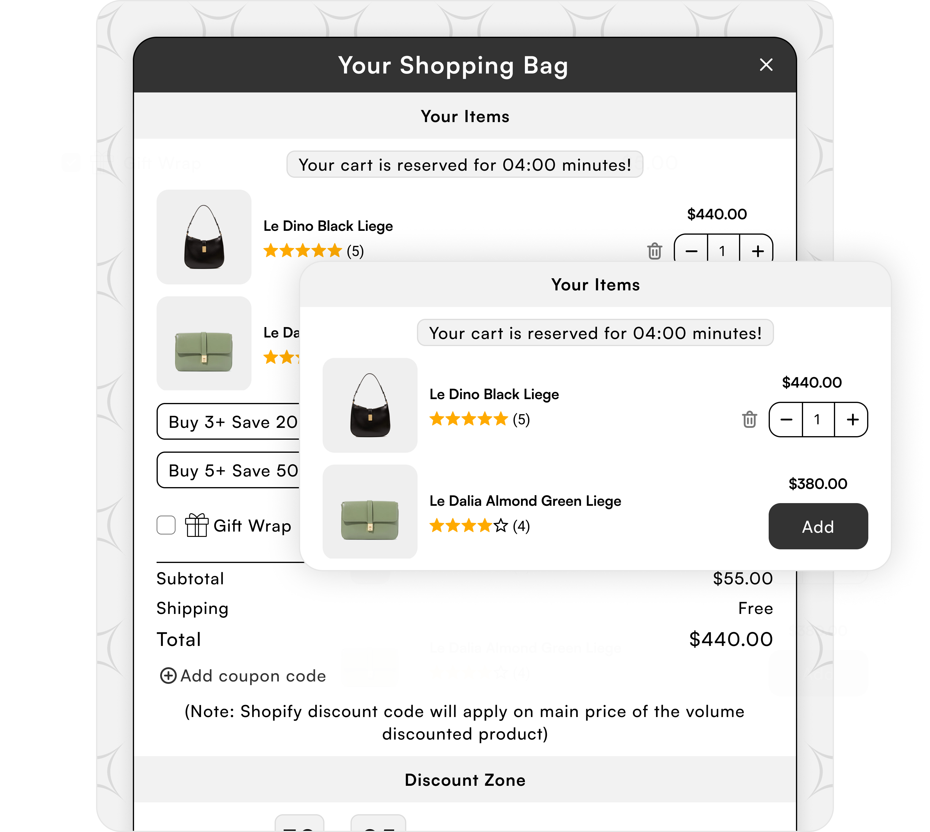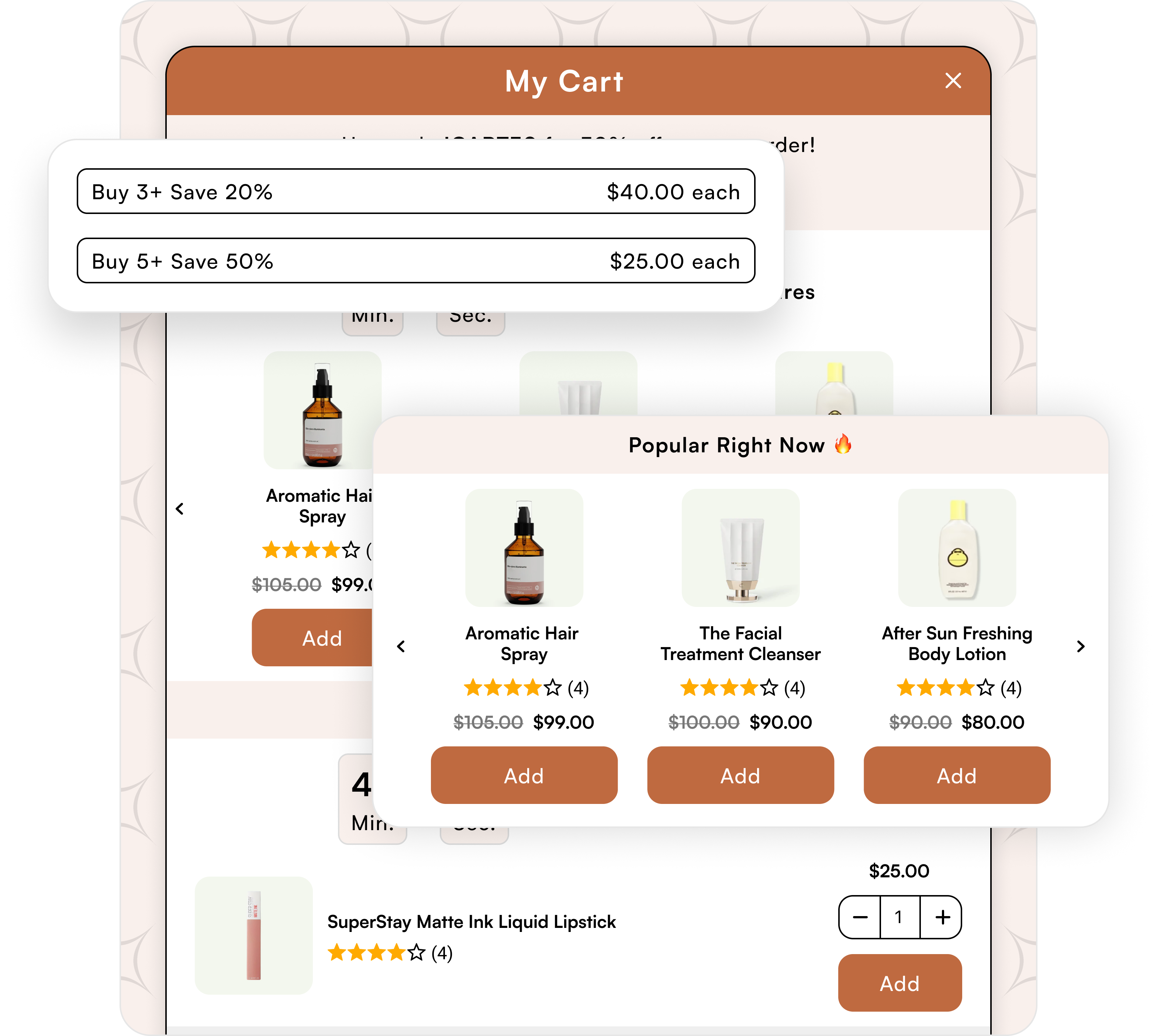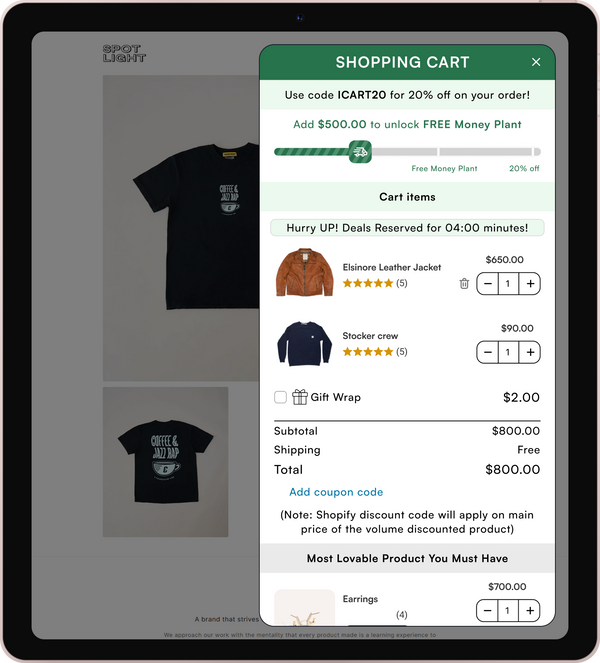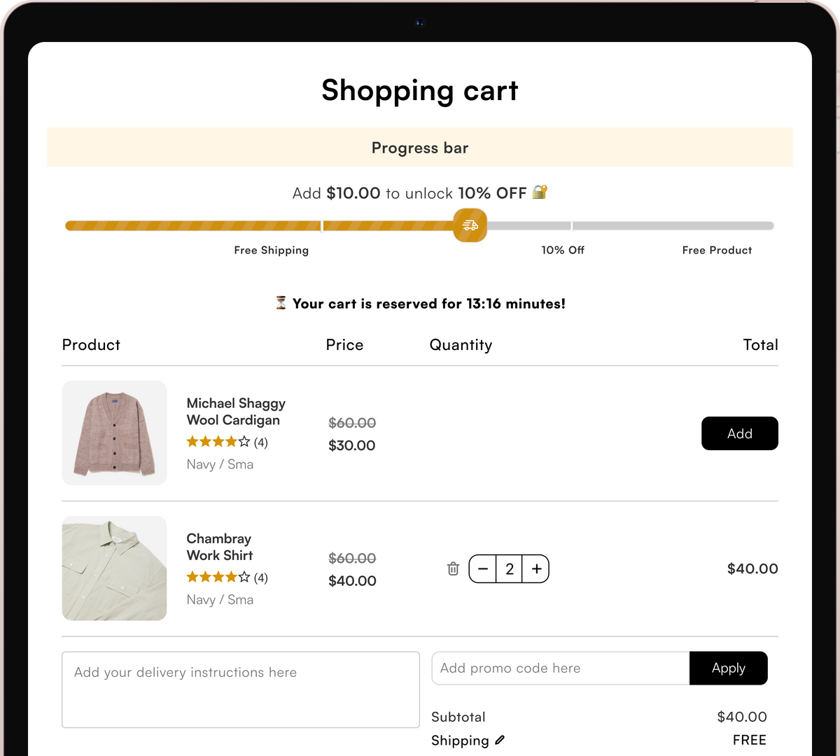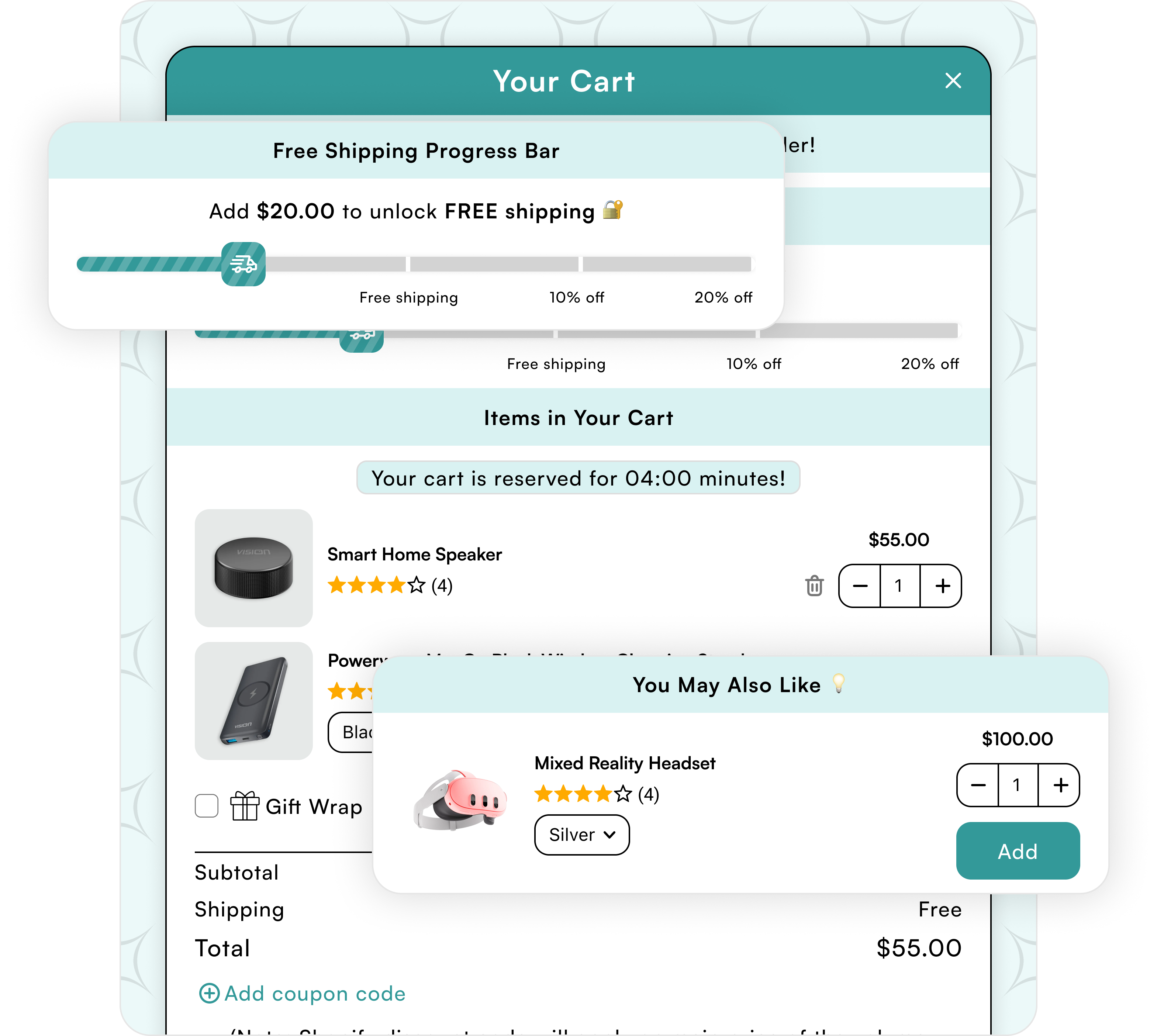 Turn abandoned carts into completed purchases with iCart. Create a fully customized cart experience in minutes & boost AOV by offering smart upsell & cross-sell offers right in the cart.